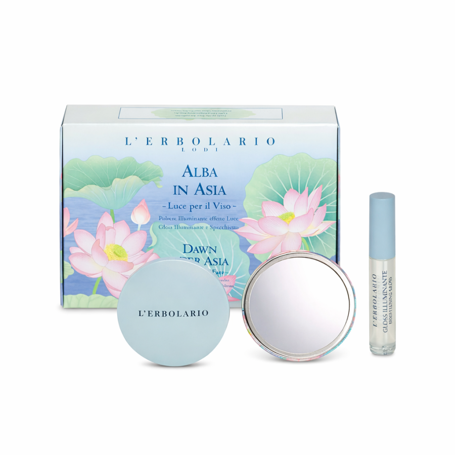 Cofanetto make-up Alba in Asia in edizione limitata con polvere illuminante, gloss effetto luce e specchietto. Un kit elegante per donare luminosità a viso e labbra, ideale come idea regalo.