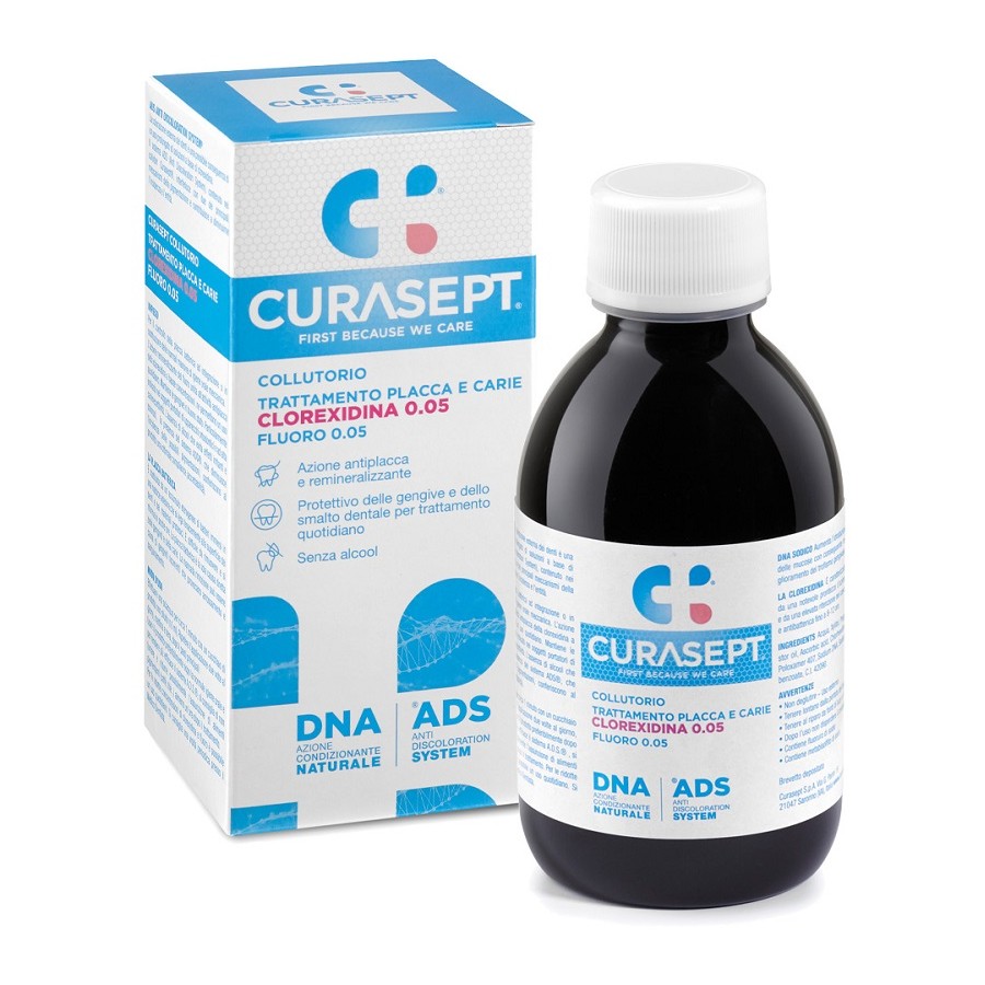 Curasept ADS DNA 0,05% è un collutorio specifico per l’igiene orale quotidiana, studiato per garantire una protezione completa contro placca e carie, rispettando denti e gengive.