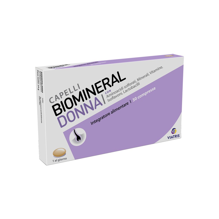Biomineral Donna è l’integratore alimentare pensato per il benessere della donna, ideale in pre-menopausa e menopausa. La sua formula completa con biotina, selenio, cistina, metionina e isoflavoni di soia contribuisce al mantenimento di capelli normali e al supporto nutrizionale durante periodi di aumentato fabbisogno. Include inoltre vitamine, minerali e probiotici per favorire energia, difese naturali e equilibrio intestinale. Basta 1 compressa al giorno per sostenere vitalità e benessere quotidiano.
