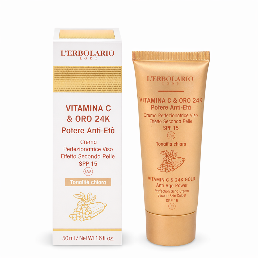 Scopri la luminosità perfetta con la Crema Perfezionatrice Viso Vitamina C & Oro 24K di L’Erbolario, una crema colorata perfezionante che unisce trattamento anti-age, make-up leggero e protezione solare in un unico gesto.