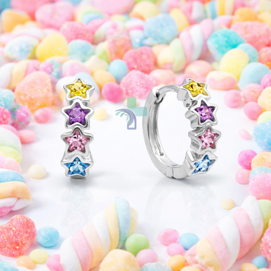 Gli orecchini Bijouxmed Post 4 Starlight sono pensati per unire sicurezza, comfort e un design giocoso. Il modello presenta una fila di stelle multicolor, luminose e delicate, perfette per chi ama uno stile allegro ma discreto.