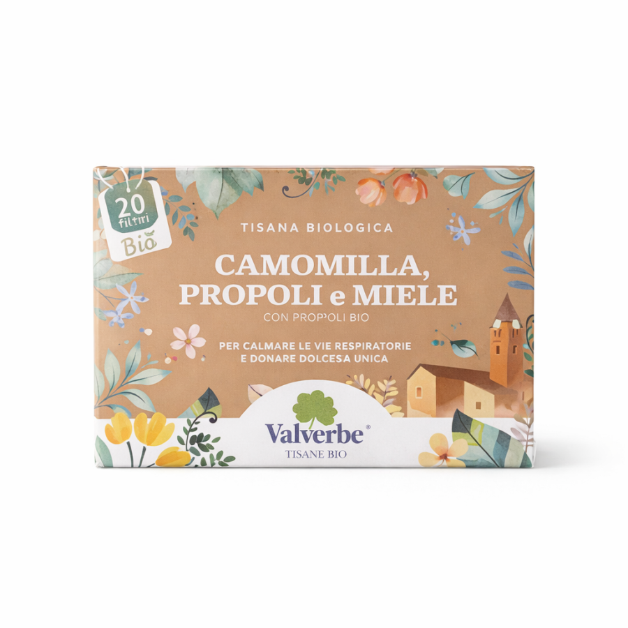 La Valverbe Tisana Camomilla, Propoli e Miele Bio è una miscela di erbe officinali biologiche pensata per offrire una bevanda calda piacevole, naturale e armoniosa, ideale in qualsiasi momento della giornata, in particolare la sera.